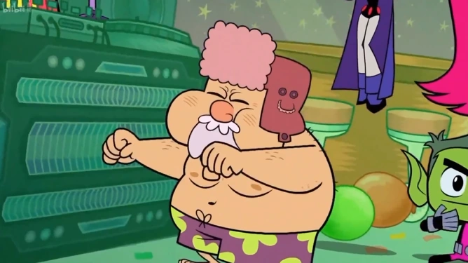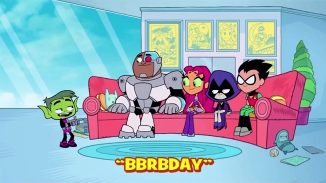 It's a brand new day, specifically BB’s B-Day! But before Beast Boy and his guests can get too excited, Robin has an announcement: it's also HIS birthday (according to him), and they're all invited—except Beast Boy, of course. The three Titans don't really care though, knowing that it’s a trick, so Robin has to try and lure them in with some cool stuff... the living room as a venue, TWO cakes, and special guest Bob Uecker. Cyborg's clearly a huge fan of the former MLB player/sportscaster/actor, but that can't compete with Beast Boy's pony rides. Despite Robin showing what fun it is to ride Bob, the team eventually chooses Beast Boy's party. As the four Titans leave, Bob tries to console Robin with some frozen custard since he thinks it's his birthday, but that's not gonna help as he claims that he's doing this out of jealousy.