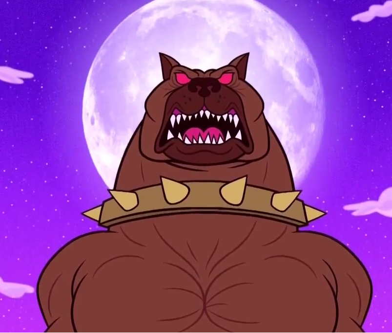 Bingo is a giant Bullmastiff with sharp teeth, red eyes, and a spiked collar around his neck.