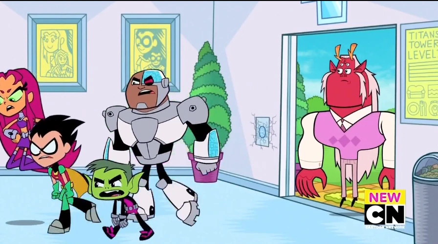 At the Titans Tower, Robin, Beast Boy, Cyborg, and Starfire are relaxing as usual when the doorbell rings. No one volunteers to answer, and the bell keeps ringing. Cyborg thinks that they might've ordered pizza, and that provokes the Titans to violently bust open the elevator, smash down the shaft, blow up in the process, and run to the door. Sadly, only a nicely dressed Trigon is there. Beast Boy asks where the pizza is, but the demon lord says he's only there to talk to Raven. They walk away angrily, and Starfire even slaps him with her hair.
