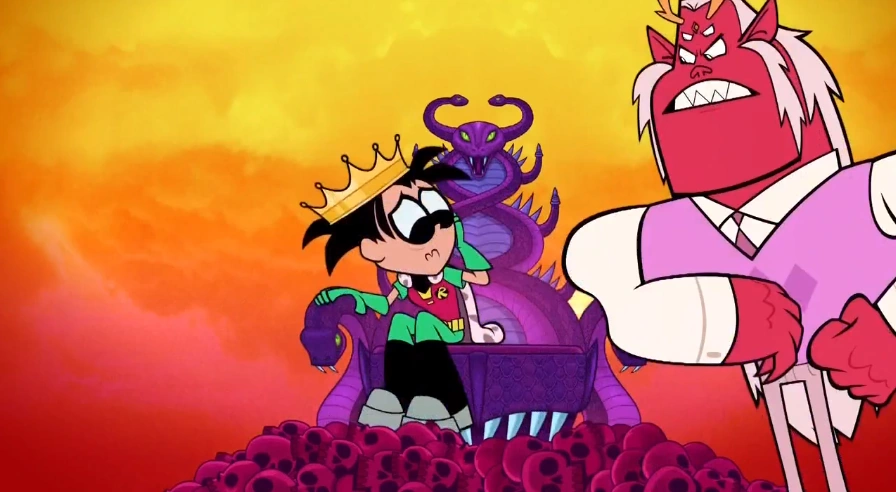 Meanwhile, Robin is on his throne in Gehenna, enjoying his "prom king" rule over his subjects. But Trigon just won't give him a break about being a geek. He slaps Robin again, saying, "Shut up, dork!"