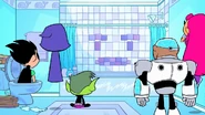 Afterwards, he announced that he and his kind will leave the world forever due to the lack of Earth peoples' thanksgiving for them, and proceeded to detach the his whole self (the entire bathroom, walls and everything), breaking away from the Titans Tower (leaving a gaping hole in the center of the Tower). All the other bathrooms in Jump City, and presumably the world, disconnected from their homes and followed John to the outermost edges of the atmosphere. The heroes watched with awe, as hundreds of bathrooms ascended into the sky. Robin said with emotion that they are finally going home, but Starfire pointed out that the bathrooms' world was destroyed... so Robin really had no idea.