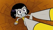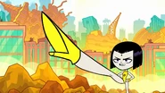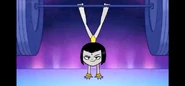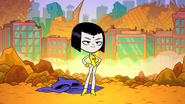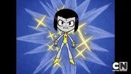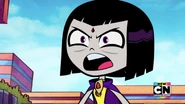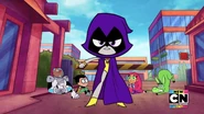 Knowing that no one else can handle the dark powers of her cloak, she decides to give up her fame and glory, and reverts back to being Raven to prevent anyone else from wearing the cloak again. Beast Boy gets upset when Raven puts her cloak back on, covering her legs, but Raven walks away from Beast Boy. Before the end of the episode, however, she looks at Beast Boy and smiles, and briefly pulls one of her legs out one more time with her Lady Legasus uniform still on, and shows it off just for a happy Beast Boy, who then morphs into a dog and pants and howls in delight/joy.