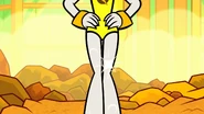 As Lady Legasus, Raven replaces her simple outfit with a saffron-colored, sleeveless leotard with matching wristbands/cuffs and yellow booties. Her leotard has her logo of a golden leg in a darker-colored circle on the chest area.
