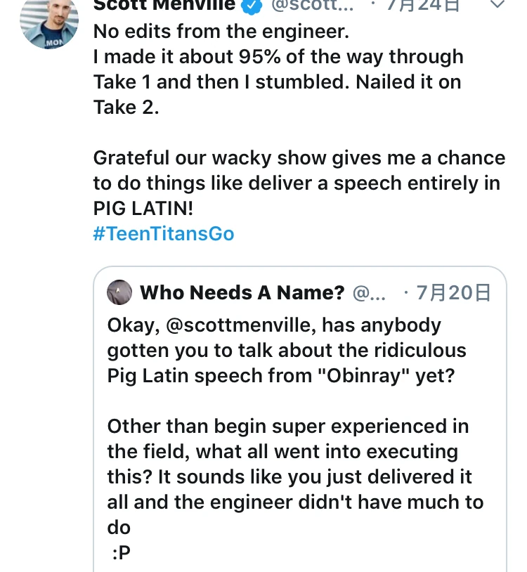 - Scott Menville replies to a tweet that “I made it about 95% of the way through Take 1 and then I stumbled. Nailed it on Take 2.” when being asked on how he executed the Pig Latin during the recording of this episode.