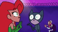 In "Bat Scouts", Poison Ivy is playing chess with Catwoman until Beast Boy cuts off the Arkham Asylum's electricity supply and chase her and her cohorts away with Cyborg and the girl Titans, which gives her the opportunity to wreck havoc in Gotham City. Of course, when Beast Boy, Cyborg and the girl Titans attempt to attack them, she along with Bane, Penguin and Two-Face effortlessly beat the four of them up, sending the four teens into the dumpster. But after the Bat Scout Titans regain morale, she gets beaten up offscreen and is sent back to the asylum with her cohorts thanks to Raven's magic.