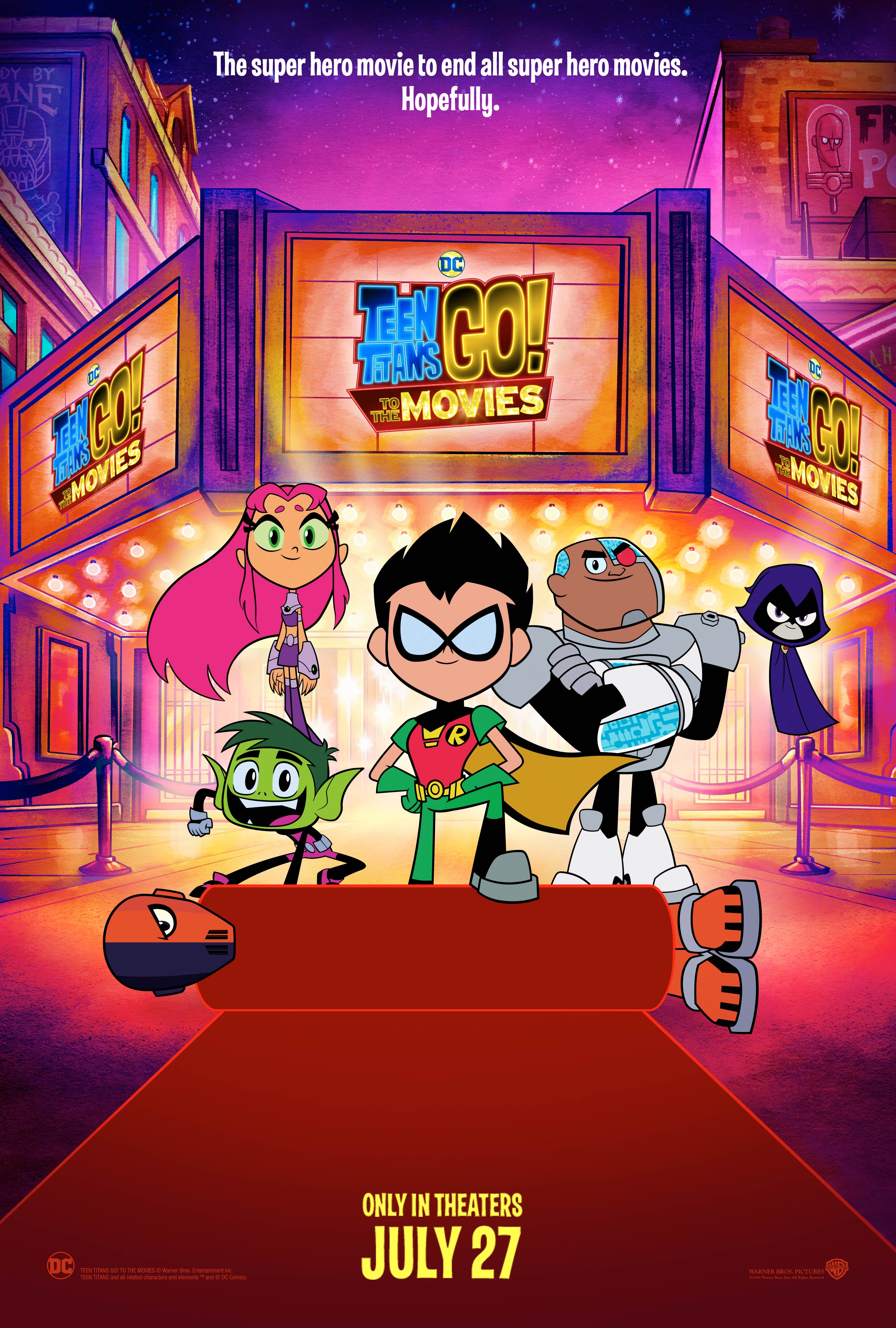 Teen Titans Go! To the Movies is a theatrical feature film based on the Teen Titans Go! series. The film was confirmed on Monday, September 25, 2017 by Warner Bros. The animated feature debuted in theaters on July 27, 2018.[1]