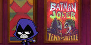 In "Bat Scouts" he was reading 101 Killing Jokes (a possible reference to the graphic novel titled Batman: The Killing Joke), when the Titans, minus Robin, trespassed into Arkham Asylum and chased them off. Later, he was shown to be terrorizing the people of Gotham City. Nonetheless, he was defeated by Cyborg, who did the Batusi, which cringed The Joker. Cyborg then punched him into a street light pole, causing The Joker to faint. He and his cohorts were teleported back to Arkham.